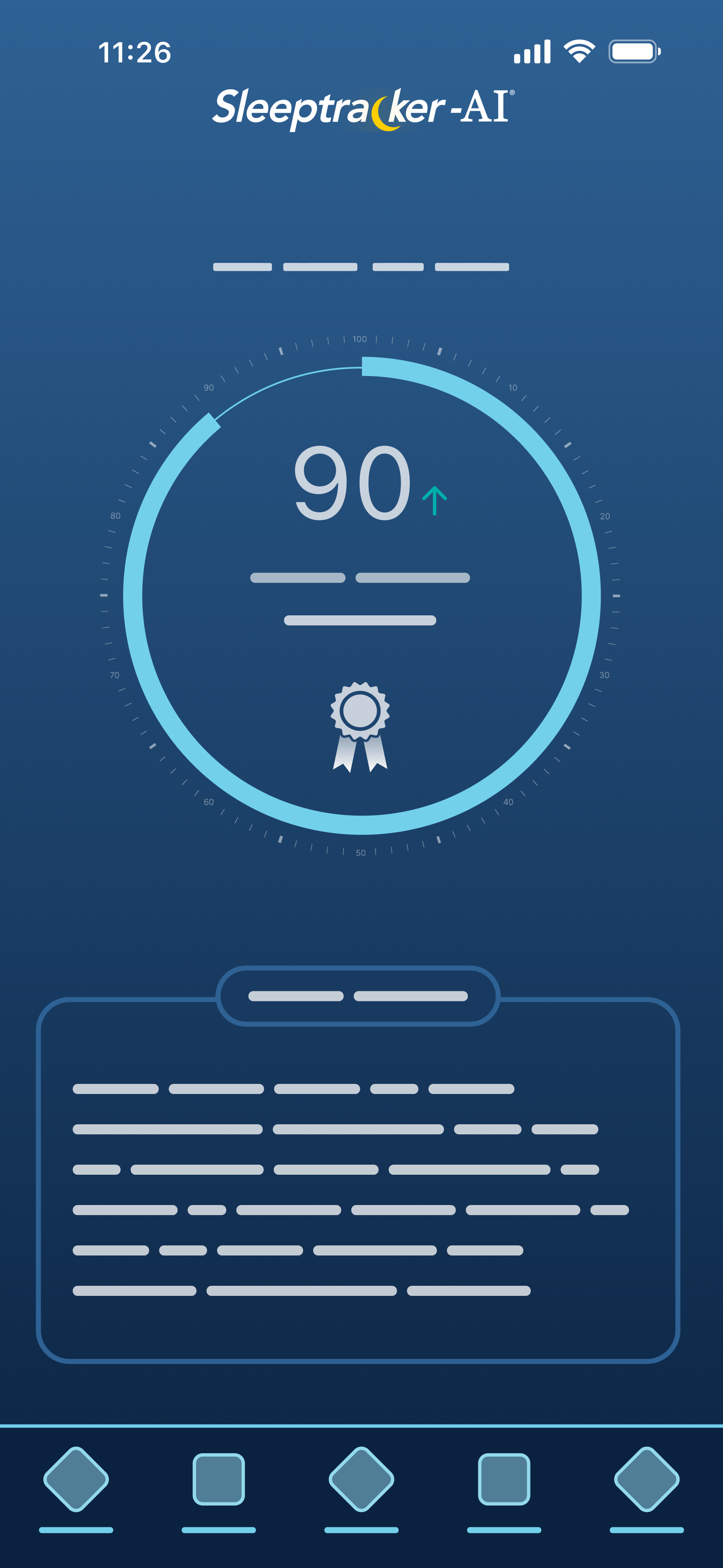 Start: Deine letzte Schlafaufzeichnung wird hier angezeigt. Die Karte am unteren Rand lässt sich nach links und rechts verschieben, um tiefere Einblicke zu erhalten, einschließlich dynamischer Informationen vom Sleeptracker-AI® Schlafcoach. Diese Informationen werden in dem Maße personalisiert, wie die App deine Schlafgewohnheiten kennenlernt.